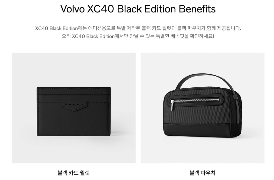 이번 XC40 블랙 에디션을 구매하시는 분들에게는 굿즈를 특별 제작해 증정해드리고 있습니다. 바로 블랙 카드 지갑과 블랙 파우치 입니다. 블랙이라는 단어에 걸 맞게 굿즈까지 블랙으로 제작하여 블랙 에디션 구매 고객님들께만 드리는 더욱 특별한 선물을 증정 해드리고 있습니다.